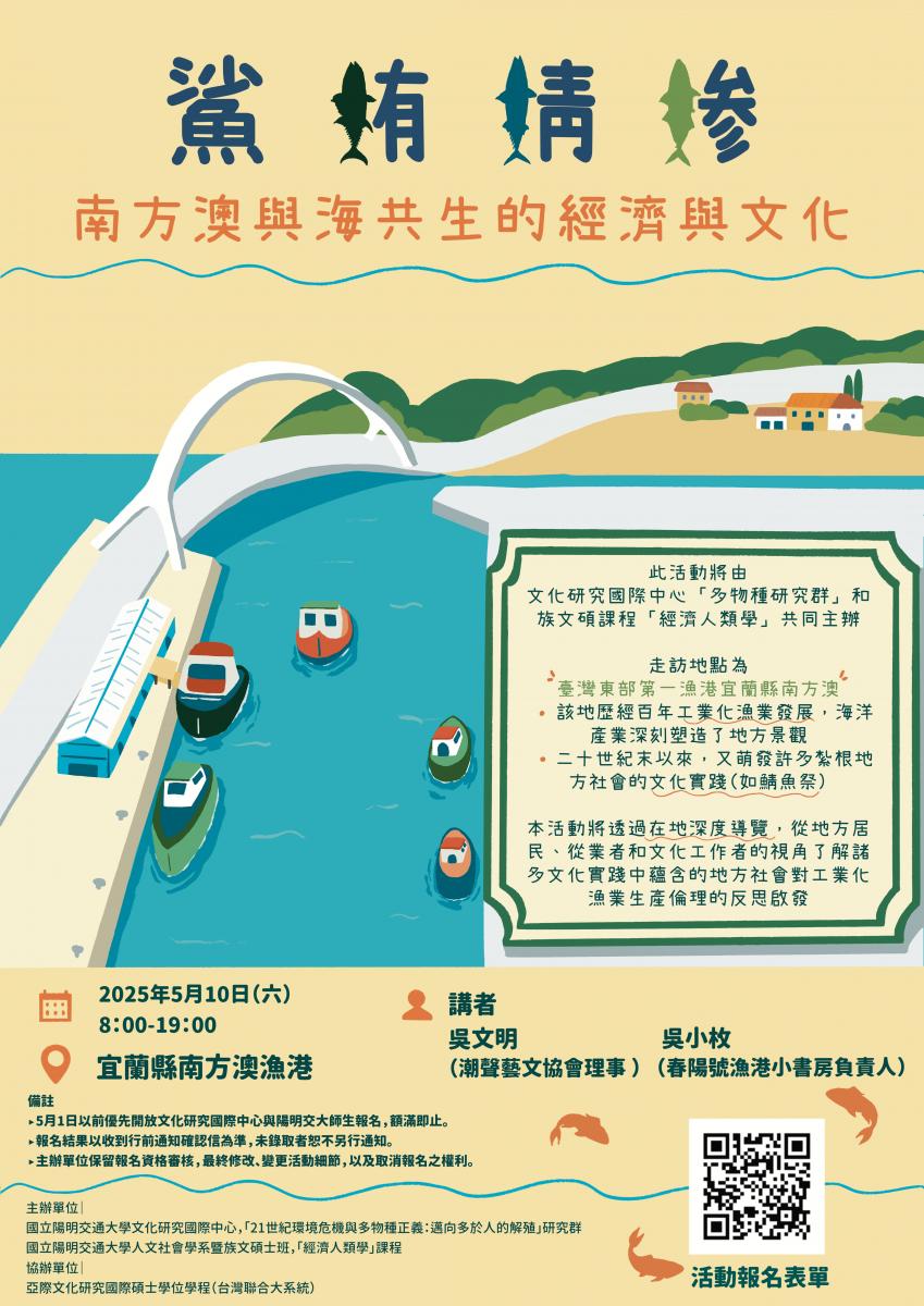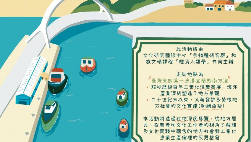 此活動由文化研究國際中心「多物種研究群」及族文碩課程「經濟人類學」共同主辦。本次走訪地點為臺灣東部第一漁港宜蘭縣南方澳,該地歷經百年工業化漁業發展,海洋產業深刻塑造了地方景觀,二十世紀末以來,又萌發許多紮根地方社會的文化實踐(如鯖魚祭),諸多文化實踐蘊含著地方社會反思工業化漁業的生產倫理。